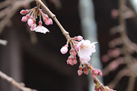 本堂前の枝垂桜がぽつぽつと花を咲かせています